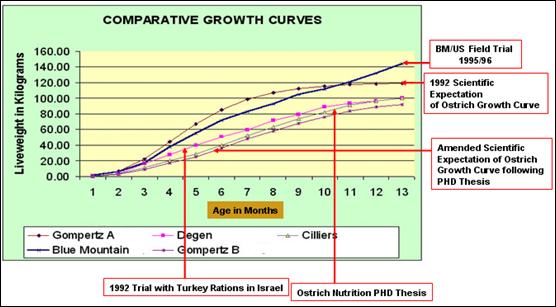 The narrative in the publication “A Practical Guide for Ostrich Management and Ostrich Products”, referenced above, discusses how the scientists used this published nutritional data to verify the accuracy of the Gompertz model for growth performance data of ostrich published by Stellenbosch University in 1992. The converse should have been the case, to use the original Gompertz model of 1992 as a measure of the accuracy of the rations discussed. When the rations discussed did not achieve growth rates close to the original Gompertz model, the researchers downgraded the original Gompertz model, believing it to be unachievable. They should have searched for reasons why they did not achieve the predicted performance levels.